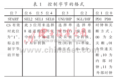 MAX186为串行工作方式,在进行A/D转换之前要对MAX186进行配置。首先将CS管脚置低电平选通芯片,在SCLK管脚输入外部时钟,在时钟SCLK的每1个上升沿把1个最高位为“1”的控制字节的各位送入输入移位寄存器,控制器收到控制字节后,选择控制字中给定的模拟通道,并在SCLK下降沿启动A/D转换。控制字节的格式如表1所示。在控制字节的最后1位之后,SSTRB管脚有1个时钟周期的高电平,在其后的12个时钟周期SCLK的每1个下降沿,转换后数据的各位出现在DOUT端,单片机从DOUT管脚读入12位数字量。