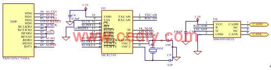 DSP通过McBSP与MCP2510的SPI接口传送数据。MCP2510的发送寄存器作为发送缓冲区的映射寄存器,DSP通过访问发送寄存器将数据传送到发送缓冲区。MCP2510有6个过滤器,CAN总线上通过接收过滤器过滤的数据首先被放到接收缓冲区中。接收寄存器作为接受缓冲区的映射寄存器,DSP通过访问接收寄存器来接受缓冲区中的数据。
