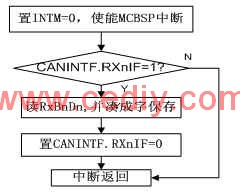 为了提高通信效率,DSP发送采取主动发送方式,由DSP的HD口(配置为IO口)和MCP2510的TXRTS端相连,以选择发送缓冲单元,发送流程如图4所示;而接收采取中断方式,一旦MCP2510接收缓冲器满,则发中断信号给DSP,通知DSP读取数据,接收流程如图5所示。