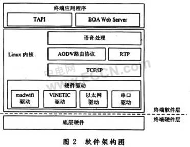 Linux内核层:为语音数据的压缩处理和语音包的实时传输提供了保证。TCP/IP协议软件栈提供了对TCP/IP的支持,考虑到语音数据的实时性要求,终端的语音传输采用UDP方式实现。建立在UDP之上的RTP协议用于保障数据流的实时可靠传输。语音处理模块提供了对G.723等音频编解码软件的支持。在网络协议栈中包括了实现多跳通话功能的AODV路由协议。