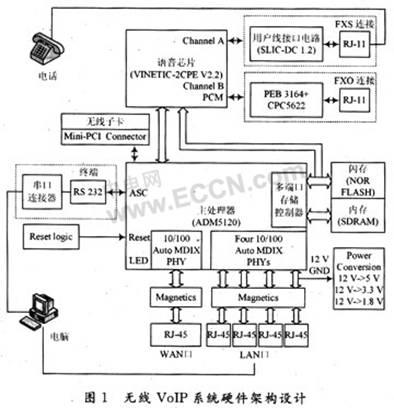 系统硬件的整体架构设计如图1所示。系统硬件主要由五部分组成:ADM5120主处理器部分、通话控制部分、无线子卡部分、存储部分和外设连接部分。通话控制部分采用Infineon公司语音芯片VINETIC-2CPE,Version 2.1(PEB3322)为子处理器,外接A/D,D/A转换功能的用户接口电路SLIC-DC PEB4268,与存储部分一起构成语音实时处理骨架;无线子卡部分采用Atheros公司的WMIA-165G 802.11g Mini PCI模块,并用Madwifi驱动无线子卡;存储部分使用2块SDRAM存储器和1块NOR FLASH存储器;外设连接部分包括一个WAN口和四个LAN口、Mini-PCI接口、输出模拟电话信号的RJ-11接口,以及用于调试的RS 232串口。