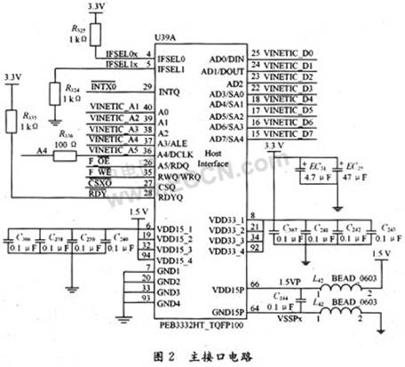 VINETIC芯片的主接口电路如图2所示。其中4和5为片选输入端;AD0~AD7:双向的输入/输出信号,相应的引脚有3种运行状态:低电平、高电平或高阻抗,当CSQ为高电平时,DOUT呈高阻状态,此时需要外接10 kΩ的上拉电阻;28和29输出数字电平,漏极开路,相应的引脚有2种运行状态:低电平有效或三态,并允许多个设备共享为线或。芯片供电电路部分:66外接锁相环路,此锁相环重要地影响到芯片的总性能,因此应特别注意对锁相环供电的滤波器;64将锁相环接地。
