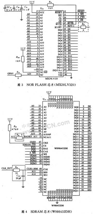 系统存储模块包括1块NOR FLASH芯片MX29LV320和2块SDRAM芯片W986432DH。MX29LV320的引脚分布如图3所示。