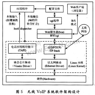 系统软件设计的整体架构如图5所示,其在无线局域网内实现了基于ADM5120的UDP方式点对点通讯和广播通讯。UDP(User Datagram Protocol,用户数据报协议)主要用来支持那些需要在计算机之间传输数据的网络应用。众多的客户/服务器模式的网络应用例如网络视频会议系统等都需要使用UDP协议。UDP协议直接位于IP(网际协议)协议的顶层,属于网络协议中的传输层协议。由于UDP协议不需建立连接,具有效率高、速度快和占用资源少等优点,应用于消息通信和实时系统中可以提高系统传输数据的效率。UDP具有组播和广播功能,是分发信息的一个理想协议。本系统还移植了一种基于ADM5120的嵌入式Web服务器boa,实现了对VoIP系统进行基于B/S方式的Web配置。