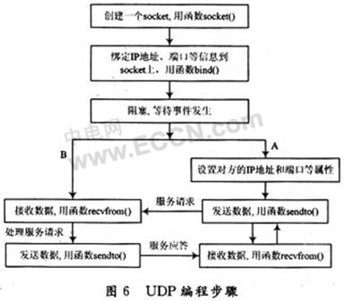 在本系统中,在一个网段内的任意两个应用程序之间可以进行全双工通信,每个应用程序既可做为服务器又可做为客户端。其UDP编程步骤如图6所示,以下是两个应用程序A和B之间进行点对点通讯的具体实现过程: