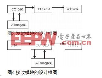 在发射模式下,合成的RF信号直接馈送到功率放大器PA,射频输出的GFSK信号是由馈送到DIO引脚的基带信号通过GFSK调制产生的。发射模块要得到200mW的输出功率,必须使用小功率放大器驱动输出。考虑到设计及调试的方便性,采用WJ公司的集成单片放大器ECG003。ECG003是一种高动态通用放大器,采用InGaP/GaAS HBT技术,ECG003的P1dB为24dBm,Gain为20dB,CC1020输出仅需要3dBm就可以了。软件分为CC1020发射模式配置软件和数据帧编码软件,发射模式配置软件是单片机通过对CC1020寄存器进行配置来完成的,数据帧编码软件是将传输的数据加上同步头和结束符组装成帧后送入发射机变成射频数据发射出去。同步头因数据格式为异步UART模式,应选用AAAA33CC这样非连0或连1的字节,以便接收稳定的直流电平。单片机选用Atmel公司的ATmega8L,其芯片内部集成了较大容量的存储器和丰富强大的硬件接口电路,具有高性能、低价格特点,可以使用C语言进行编程开发。发射模块的框图见图3。