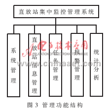 系统的管理功能分为5大模块:系统管理、直放站信息管理、任务管理、报警管理和统计分析,如图3所示。