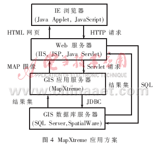 电子地图功能可通过WebGIS系统中的MapXtreme实现。MapXtreme是MapInfo公司开发的一个基于互联网技术的地图应用软件,其中,MapXtreme for Java版本是100%纯Java产品,具有跨平台、组件化、面向对象、符合J2EE规范等特点和优势,因此选用它作为开发平台。使用MapXtreme开发WebGIS应用,开发人员能集中控制以及维护地图和数据库数据,并集中实现地图应用程序功能。此外,由于使用IE浏览器作为客户端的使用界面,可使开发人员将地理信息系统紧密地与其他系统相结合,给用户提供统一、完整的综合信息服务。基于MapXtreme的WebGIS应用方案如图4所示[4]。