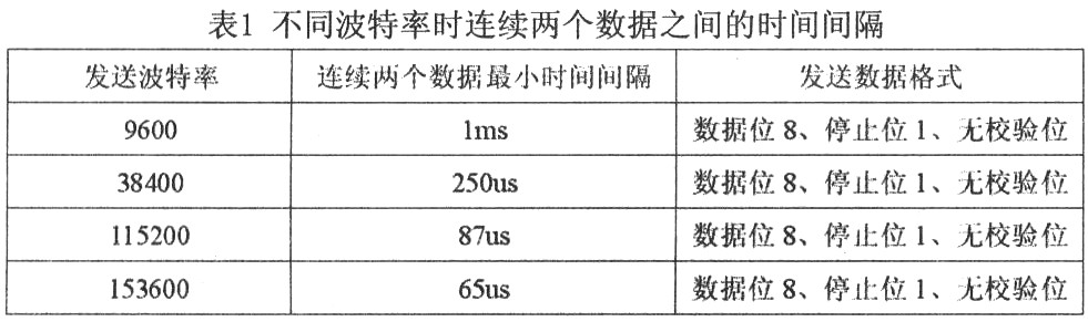 系统实际工作所需波特率分别为9600、38400、115200、153600 。分析计算可得不同波特率发送数据时,连续两个数据之间的时间间隔如表1所示: