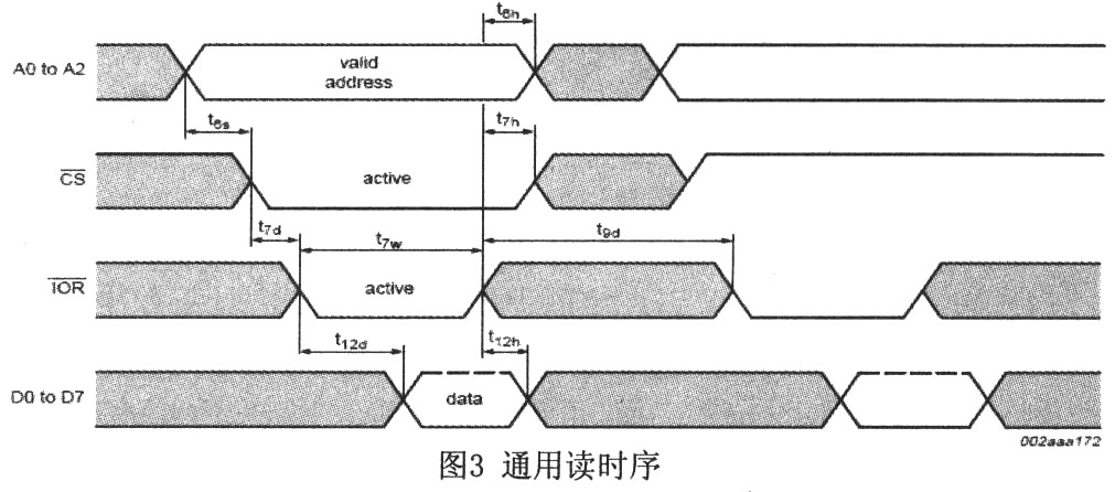 其中t6s=0ns t6h=0ns t7h=0ns t7d=10ns t7w=26nst9d=20ns t12h=15ns都为最小值,t12d max=26ns由图3可以看出:对串口进行一次读操作所需的时间T=t6s+t7d+t7w+t9d所以T最小为56ns。本设计采用60MHz时钟分频出10MHz时钟,在一个1OMHz时钟周期(100ns)内完成一次读操作。用6 0 MH z时钟同步一个计数器cscount[2:0],在第一个6 0MH z时钟的上升沿(cs_count=3’b000时)置CS为低,并赋对应的地址给UART A;在第二个60MHz时钟的上升沿(cs_cout=3’b001时)置UART IOR为低;在第四个60MHz时钟的上升沿(cs_count=3’b011时)置CS、UART IOR为高。这样UART IOR有效时间为两个时钟周期(33ns),且比CS延时一个时钟周期(17ns),完全满足图3读时序的要求。