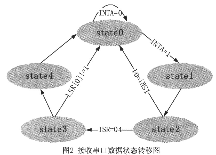一个完整的读取串口数据操作需要进行三次读操作:读中断状态寄存器(ISR)、读线状态寄存器(LSR)、读接收保存寄存器(RHR)。由于这三次读操作具有严格的逻辑顺序和时序关系,非常适合采用状态机来描述;所以本设计采用有限状态机来实现读取串口数据。图2为读通道A数据的状态转移图。