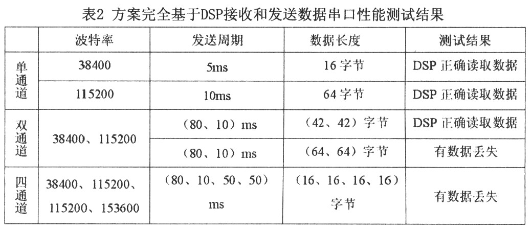 2多通道同时工作时:由表2测试结果可以看出,每次发送的数据量过大、或发送周期较小时,由于DSP对串口芯片中断请求的处理速度问题就会造成数据丢失。由表3测试结果可以看出,四通道工作时,发送数据长度为64字节,通道发送周期最小可达10ms;如果发送数据长度减小,通道发送周期还可以更小。该设计性能远远好于方案改进前完全基于DSP接收和发送数据的性能;能满足系统实际工作的需要。
