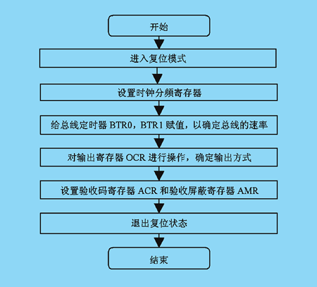 软件设计的主要任务是实现数据和控制命令在CAN总线网络和RS-485总线之间的传输。它主要包括RS-485和CAN接口的初始化程序、报文发送和接收程序、中断服务程序和错误处理程序等。其中,SJA1000的初始化程序是软件设计中的难点,需要完成各种工作参数的设置。其中,控制寄存器用来改变CAN控制器的行为,包括进入复位状态,激活不同类型的中断源,如接收中断、发送中断和数据溢出中断等。验收代码寄存器和验收屏蔽寄存器共同作用定义了能被节点所接收报文的条件:所收信息的标识符的相应位与验收代码寄存器验收码的相应位相等。 验收屏蔽寄存器的作用是确定验收码的哪些位对于验收滤波是相关的或不相关的。总线时序寄存器0定义了波特率的预设值及同步跳转宽度;总线时序寄存器1则定义了位周期的长度、采样点的位置和采样数目。输出控制寄存器可以设置不同的输出模式(如正常输出模式、双相输出模式和时钟输出模式等)。时钟分频寄存器不仅可以控制SJA1000的输出频率及屏蔽CLKOUT引脚,而且还能够对Basic CAN和Peli CAN模式进行选择。具体的SJA1000初始化程序流程如图2所示。