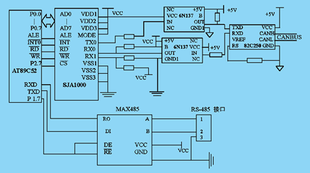 (3) 如果RS接地,就选择了高速工作方式。高速光电耦合器6N137实现了CAN控制器和收发器之间的电气隔离,增强了系统的稳定性和抗干扰能力。RS-485收发器MAX485是一种差分平衡型的小功率收发器,包含一个驱动器和一个接收器,使用单+5V电源供电,专门用于TTL协议(即通用于各型CPU的通信协议)和485标准之间的相互转换,使微控制器可以利用RS-485串行通信协议直接进行串行通信。