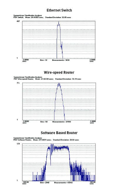 图3:表明以太网交换机(上部)、线速路由器(中间)和软件路由器(底部)延时的柱状图。线速路由器性能相当于两层交换机,而软件路由器的PDV高出了两个数量级。