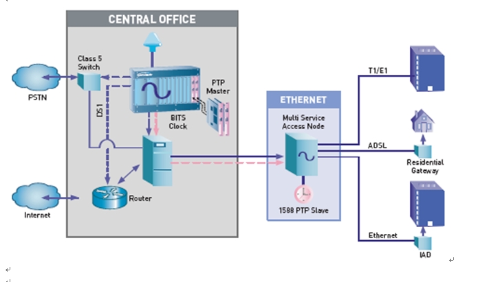 图5:支持传统TDM业务的MSAN要求从中心局开始经以太网回传进行同步分配。MSAN中的PTP从时钟可以从中心局BITS/SSU中的PTP最高级时钟获得同步。