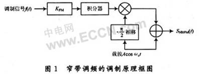 至此,得到窄带调频的一般表达式。以式(7)作为数学模型,可直接建立窄带调频的原理框图,如图1所示。