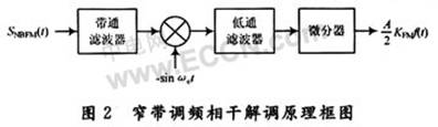 由上面的推导可知,窄带调频可以由乘法器实现,因此必然可用相干解调的方法来回复原调制信号,如图2所示,NBFM信号在接收端首先经过带通滤波器(BP)滤除频带外信道加性噪声,然后经过乘法器与载波(-sinωct)相乘,用低通滤波器滤除乘出来的高频分量,最后经微分器去掉f(t)外面的积分,在输出端恢复原调制信号f(t)。