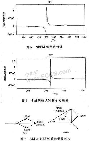 从图7中可以看到,在NBFM中,由于下边频为负,它们的合成矢量与载波正交相加,使得NBFM存在相位变化△φ。当满足式(5)时,△φ非常小,引起的幅度变化可以忽略。这是NBFM属于角度调制,区分于AM的本质所在。因为在AM中,上下边频的合成矢量与载波同相,不存在相位变化。