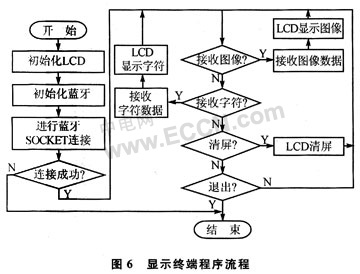 系统软件同样分为主机部分和显示终端部分。这里主要分析显示终端部分软件的设计,主机部分与其类似。显示终端部分程序包括:LCD液晶屏初始化,蓝牙设备的初始化,蓝牙连接的建立和图像字符数据的传输显示等几个部分。程序流程如图6所示。