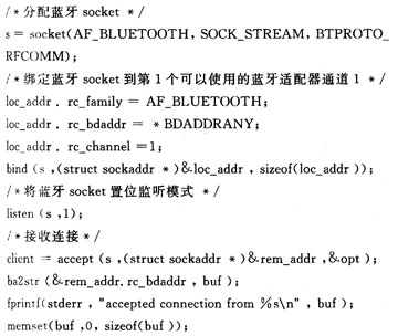 该部分采用了蓝牙socket编程。通过建立蓝牙RFCOMM协议层的socket进行连接。连接建立成功之后可以调用函数recv或者read读取主机发来的数据,主机端则对应地采用函数send或者write发送数据。通信结束之后可以调用函数close结束连接。