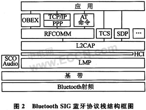 系统通过蓝牙协议栈的RFCOMM协议层进行通信。RFCOMM协议提供串行数据传输,并能在2台蓝牙设备之间同时维持多达60个连接,可以同时支持遗留串行端口应用程序以及其他应用程序中的OBEX协议。蓝牙协议栈的结构框图如图2所示。