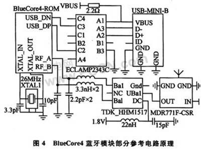 PC主机使用USB接口和BlueCore4蓝牙模块连接,对应的蓝牙模块同样通过USB接口和S3C2440A的USB-HOST接口进行连接。USB接口具有即插即用的优点。通过Linux操作系统的支持,该模块还可以使用通用的USB蓝牙适配器替代。BlueCore4蓝牙模块部分参考电路原理如图4所示。
