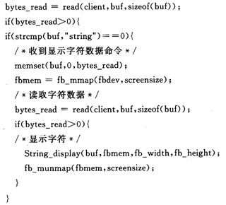 该段程序利用接收到的字符数据得到对应的显示字库数据,然后通过frambuffer显示接口显示到LCD液晶屏上面。源程序带有显示字库文件,该文件通过编译并嵌入可执行代码,然后下载到显示终端文件系统。系统这里只添加了英文字库和对应的显示代码,可以正常显示英文字符。如果需要,通过添加中文字库和少量显示代码就可以很方便地实现中文字符的显示。图像部分程序则是将接收到的位图数据通过frambuffer显示接口直接显示到LCD液晶屏上面。