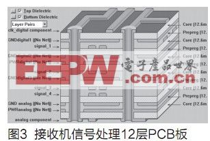 本设计中,接收机布线坚持2W原则:布线宽度为W,线间距不小于2W。PCB电路板分为模拟层和数字层两个部分,共12层,制版安排见图2,布线安排设计如下。