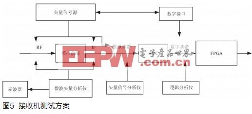 在本文设计接收机的调试过程中,用到仪器为:数字接口(Agilent N5102A),矢量信号源(Agilent E8267D),微波矢量分析仪(Agilent 89650A),示波器(Tektronix TDS 3032B),矢量信号分析仪(Agilent 89611A),逻辑分析仪(Agilent 16900A)。上述仪器,对接收机测试的连接图如图5所示。