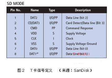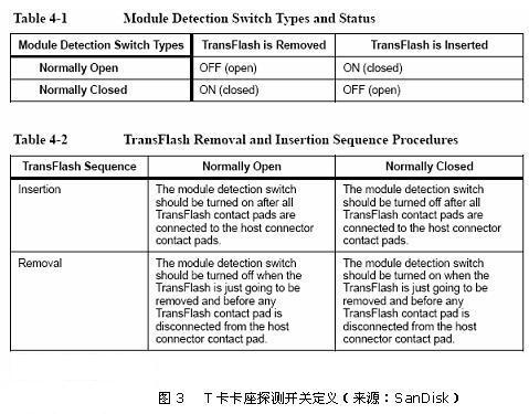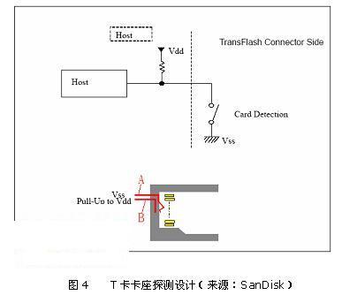 需要指出的是,TransFlash规范并没有规定卡座必须有探测开关,更没有规定探测开关的实现方式。因此在电路设计时,必须查询所用卡座的规格书,了解其探测开关的实现方式,根据处理器中断电平的要求,灵活处理。