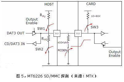 MTK的MT6226型基带处理器即可实现这样的探测功能,图即是其手册中给出的推荐电路。但该设计需要在电路板上设置一电阻,并且需要利用电子开关对电阻与CD/DAT3信号线的连接进行通断控制。由于此设计比较复杂,笔者了解到很少有厂家使用这种参考设计。