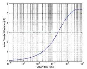 图5 VBW/RBW之比对随机噪声信号标准偏差的影响。在VBW不小于3倍的分辨率带宽时,其对VBW的信号偏差没有实际影响