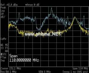 幸运的是,测量技术的发展已经可以满足这些需求。上面介绍了如何使用实时频谱分析仪发现瞬态信号和EMI隐患。在下面的实例中,单个的瞬态信号会产生一串瞬态信号,这些信号每次只持续很短的时间。在本例中,该设备是一种嵌入式系统,在把数据缓存到硬盘时导致了瞬态EMI。在使用扫频分析仪的峰值检波器简单检查后(黄色轨迹,如图6所示),似乎只有一个连续信号;把仪器保持Max-hold几分钟,同时循环DUT工作模式,会指明问题(蓝色轨迹)。但在峰值检波模式下进行快速扫描会得到黄色轨迹,没有检测到问题。