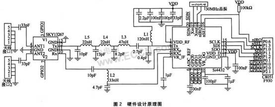为了达到较好的通信效果,Si4432的接收低噪声放大器匹配电路和发射功率放大器匹配电路的阻容参数,应严格按照数据手册提供的参数选型。前端的分集式电路采用SKY13267,其V1脚和V2脚分别连接Si4432的GPIO1和GPIO2。通过这款交叉开关实现分集式天线发送和接收通道的自动切换。