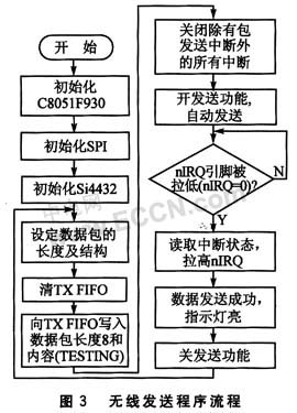 软件编程采用模块化设计思想,系统中各主要功能模块均编成独立的函数由主程序调用。功能模块包括:初始化程序(包括初始化C8051F930、SPI、Si4432),无线发送程序,无线接收程序等。无线发送程序负责写入数据载荷,并根据通信协议为数据载荷加上前导码、同步字、数据载荷长度及CRC校验字节,形成数据包将其发送出去;无线接收程序负责接收并检验数据包中的CRC字节,以确保接收到的数据的正确性。