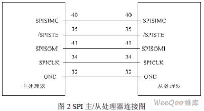 让两个 DSP 分别工作在主、从操作模式下,两者的引脚连接如图2 所示。主处理器通 过SPICLK 脚向整个通信网提供串行时钟,控制着系统的数据传输;通过SPISTE 脚给从处 理器提供片选信号,低电平有效;通过SPISIMO 脚把数据输出到从处理器的SPISIMO 脚上; 通过SPISOMI 脚接受从机处理器SPISOMI 脚上的数据。
