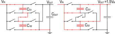 电容式驱动拓扑结构的主要贮能元件是电容,按照负载端的要求可以产生1倍、1.5倍或者2倍于输入的输出电压,从图3到图5分别是它们的工作原理。