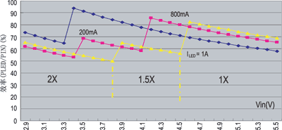 其中M是电压变化倍数。图6所示为在不同设定电流处,在这几种倍数关系时效率的变化曲线。假定输入电压为3.6V,输出电压为3.5V,如果采用2倍升压,则效率仅有50%,如果1.5倍升压则效率只有65%,而1倍升压的效率可以达到97%以上。