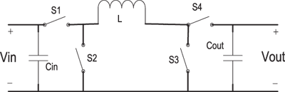 电感式结构的主要贮能元件是电感,输出电压可以通过控制一个周期内的充放电的占空比,来达到线性调节,图7所示为一个能够自适应实现升压或降压的拓扑结构,它的工作原理是:(1)S1和S3闭合,升压模式,电感两端的电压等于输入电压;(2)S1和S4闭合,前向导通模式,电感两端的电压等于输入电压减去输出电压;(3)S2和S4闭合,降压模式,电感两端的电压等于反向输出电压。