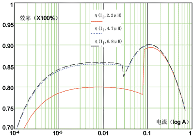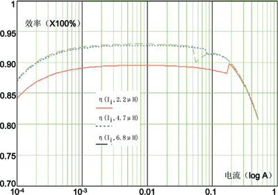 综合升压和降压的仿真结果可以得出,在2MHz的开关频率和MOS管的设计内阻近似为0.17Ω条件工作时,贮能电感的取值范围可以小于4.7μH,由图中可以看出,在一般情况下2.2μH甚至1.5μH都是可以接受的,这就意味着不但降低了成本,而且还可以在PCB设计中节省布局空间。