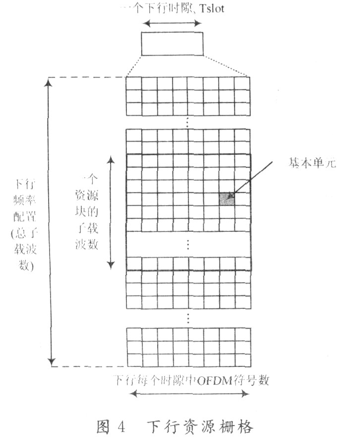 图4是LTE中基于OFDMA的下行资源栅格示意图,基于用户调度的资源块定义为:时间域连续的OFDM符号数和频率域连续子载波块的乘积NDLsymb×NRBBW。在上行资源调度中,资源块定义为一个子帧和参数NTX和k0。这两个参数决定了传输带宽和频率跳频模式。NTX也以12个虚拟子载波为单位。