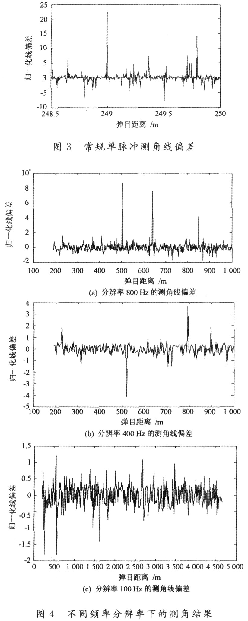 为了验证频域高分辨测角的效果,图3、图4分别给出常规单脉冲测角和不同频率分辨率下的测角结果。其中测角结果用归一化的线偏差来表示。可以看出常规单脉冲测角误差比较大。分辨率为800 Hz,400 Hz和100Hz的测角结果如图4所示。可以看出,测角精度大大提高,并且分辨率越高,测角精度越高。