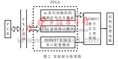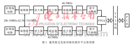 雷达发射过程:先由可编程逻辑器件(FPGA/CPLD,下同)编程产生一m系列伪随机码调相脉冲信号,经AD9857数字正交上变频器上变频到40.5MHz后,经过滤波、功率放大和混频后得到射频信号,再由射频端电路和功率放大后,馈送到天线发送出去。雷达接收过程:天线接收到的回波信号先经射频端电路滤波和放大后,与本振信号混频得到中频信号,再经滤波放大和模数转换后送入数字下变频器降速处理得到低速的数字基带信号,最后送给可编程逻辑器件进行相关的处理。与此同时,可编程逻辑器件处理后的信号经VXI(VME Extension for Instrumentation)总线送入PC主机。这种设计的最大好处就是发射脉冲编码信号由可编程逻辑器件编程产生,修改灵活,并且接收到的回波信号的处理以及和VXI总线的接口电路都可在可编程逻辑器件中一起设计,大大提高了系统的集成度,充分体现了软件无线电思想的优势。