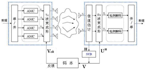 在实际通信系统中,反馈信道信息会占用较多的资源,而且在快衰落信道中,对反馈信息的效率和准确度要求较高,这时采用部分反馈的方法较为合适。最典型的部分反馈方案包括:基于码本的预编码,基于统计量的预编码等。接收端收到训练序列之后,从一系列的码字集中搜索出来的最佳的预编码矩阵 ,并将其序号和信道信噪比信息反馈给发射端。