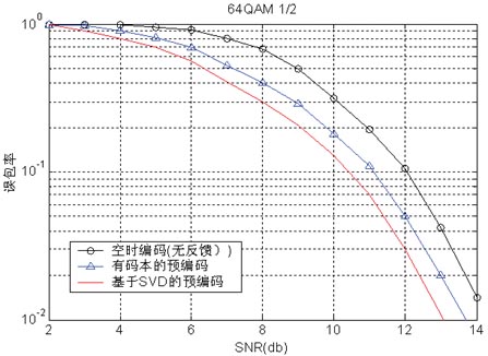 4 仿真以验证预编码的效果。我们采用ITU信道模型(步行A,3km/h),设发射天线数为2,接收天线数为2,调制方式为64QAM,采用1/2卷积编码。发射天线和接收天线的相关系数分别为0.2和0,信道为平衰落Rayleigh信道模型,假设各天线间信道相互独立。基于无反馈STC空时编码、SVD的预编码反馈和理想反馈的误包率曲线如图4所示。从图中可以看出,闭环MIMO系统要优于开环系统,基于SVD的与编码系统要优于有码本的预编码系统。