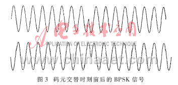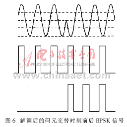 不同的结果送入单片机处理,即可得出测试信号与原始信号的相位差,做相应处理后输出锁相,并把该输出管脚设置为PWM模式,控制场效应管输出得到调制信号。经过解调后的码元交替时刻前后BPSK信号如图6所示,连续的8个脉冲代表数据bit0,若该时间内没有脉冲则代表数据bit1。