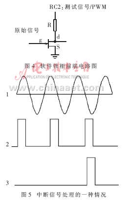 单片机软件实现位同步的处理,其思想是:由单片机定时器产生相应的时钟信号,由接收信号校正该时钟信号,使之与接收的信号相位一致。实际上也就是根据数据信号的正负边沿跳变的时刻,调整本地载波输出信号的起始定时时刻。由单片机管脚检测到信号后进入中断处理,而在另一管脚输出连续相位增量为90°的3组测试信号。软件锁相前端电路图如图4所示,测试信号作用于场效应管上。图5为中断信号处理的一种情况:通道1为原始信号,通道2为测试信号,第1个测试信号落在原始信号的0~90°相位区,所以直到第3个测试信号时才作用于原始信号得到1个脉冲,如图5中的通道3所示。