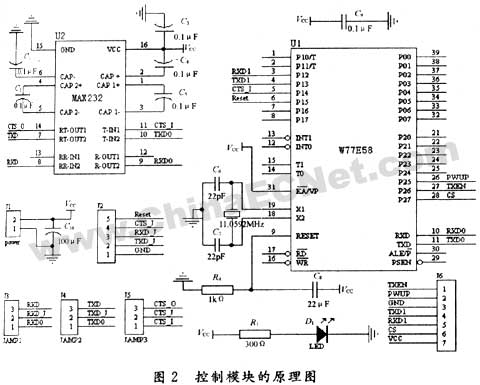 控制模块负责对无线射频模块状态切换及信道切换的控制,选用华邦单片机w77e58,控制模块的设计分为硬件电路的设计和软件的设计两部分。