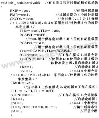 w77e58片内自带有两个串口,其中串口0可以使用定时器t1或定时器t2作为波特率发生器;串口1只能使用定时器t1作为其波特率发生器[4]。本设计中采用t2做为串口0的波特率发生器,采用t1做为串口1的波特率发生器,两个串口均工作在串口模式1,波特率为9600b/s,串口0占用了第4号中断,使用scon,sbuf做为其串口控制寄存器和串口数据缓冲器;串口1则占用了第7号中断,scon1,sbuf1做为其串口控制寄存器和串口数据缓冲器。对串口的初始化函数为init_serialport(),函数定义如下: